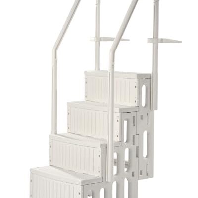 Constructed from durable PE material, the ladder resists sun exposure, weathering, and everyday wear. The snap-on installation system simplifies setup, and the hollow side panels allow water to flow through, reducing buoyancy. For maximum stability, fill the internal pipes with water or sand during installation.