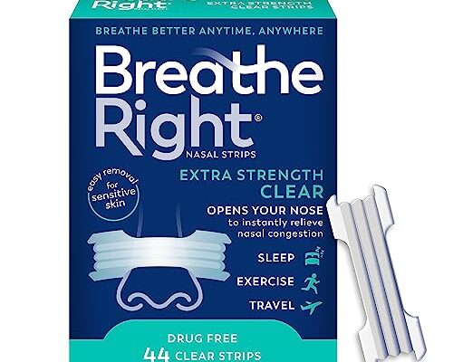 Breathe Right Nasal Strips | Extra Strength | Clear | For Sensitive Skin I Drug-Free Snoring Solution & Nasal Congestion Relief Caused by Colds & Allergies | 44 Count (Packaging May Vary)