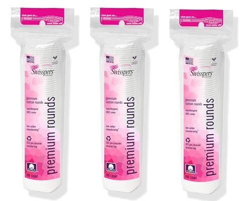 Swisspers Premium Cotton Rounds are a vegan, dermatologist tested cotton pad designed for makeup removal, toner application, nail polish removal and gentle pet eye care. The product is hypoallergenic and free of parabens, chlorine and other harsh chemicals, making it suitable for sensitive skin.