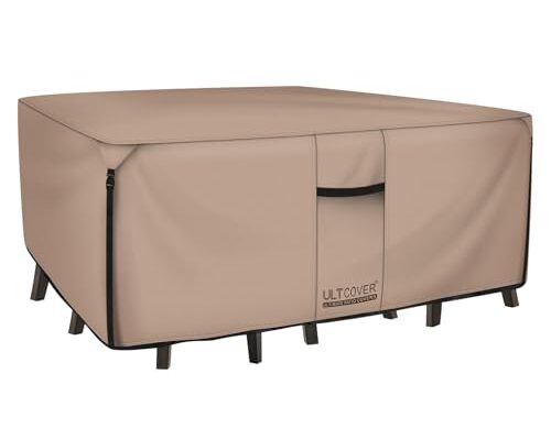 The ULTCOVER Rectangular Patio Heavy Duty Table Cover protects outdoor dining sets up to 88 inches long and 62 inches wide with a robust 600D polyester canvas and a waterproof backing that keeps rain, hail, snow, dust, leaves and bird droppings at bay.