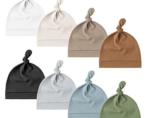 The set includes eight solid-colored knot-top beanies that keep little heads warm while adding a playful touch. With a circumference of approximately 13.3 inches, the hats fit comfortably on newborns, and the adjustable knot provides a secure closure. Ideal for everyday wear or as a thoughtful gift for baby showers, these caps pair effortlessly with any outfit.