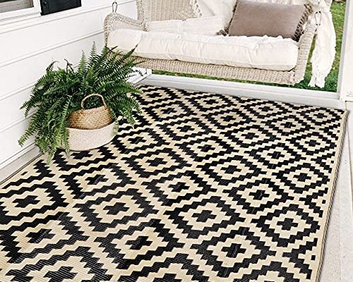 SAND MINE Waterproof Outdoor Rug 5×8 ft, Plastic Reversible Rug, Modern Area Rug, Large Floor Mat for Outdoors, RV, Patio, Backyard, Deck, Picnic, Beach, Camping, Black & Beige