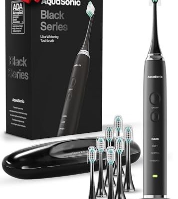 Aquasonic Black Series Ultra Whitening Toothbrush – ADA Accepted Electric Toothbrush- 8 Brush Heads & Travel Case – 40,000 VPM Electric Motor & Wireless Charging – 4 Modes w Smart Timer